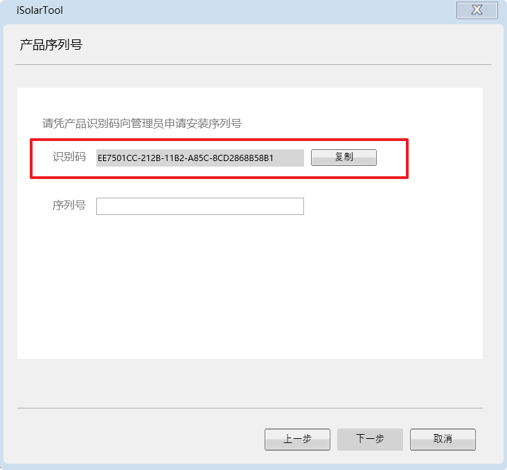 (2) 用户将识别码发送给超级管理员,管理员会根据识别码生成电脑的唯一序列号,用户直接粘贴到序列号栏中,进入下一步;