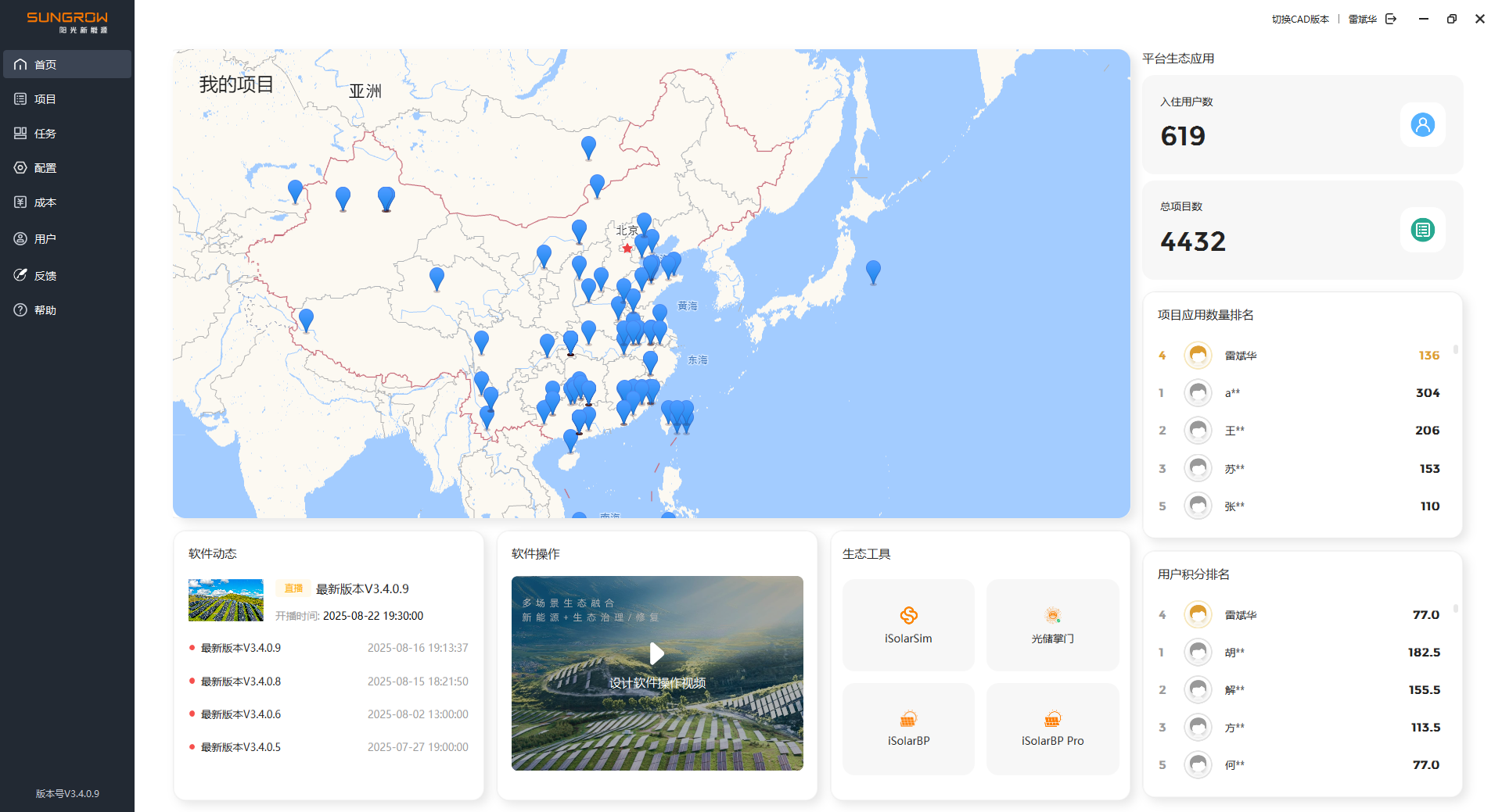 登录进入界面后进入首页,包含工具栏、软件动态、操作视频、生态工具、用户积分排名等界面。3.2. 项目管理