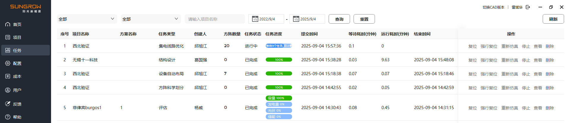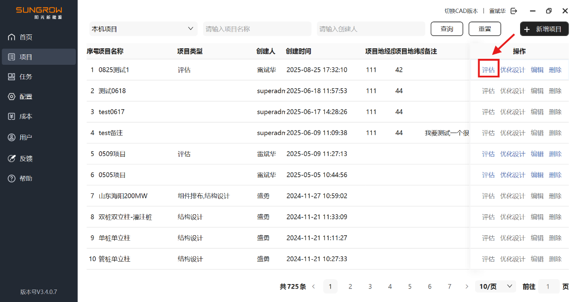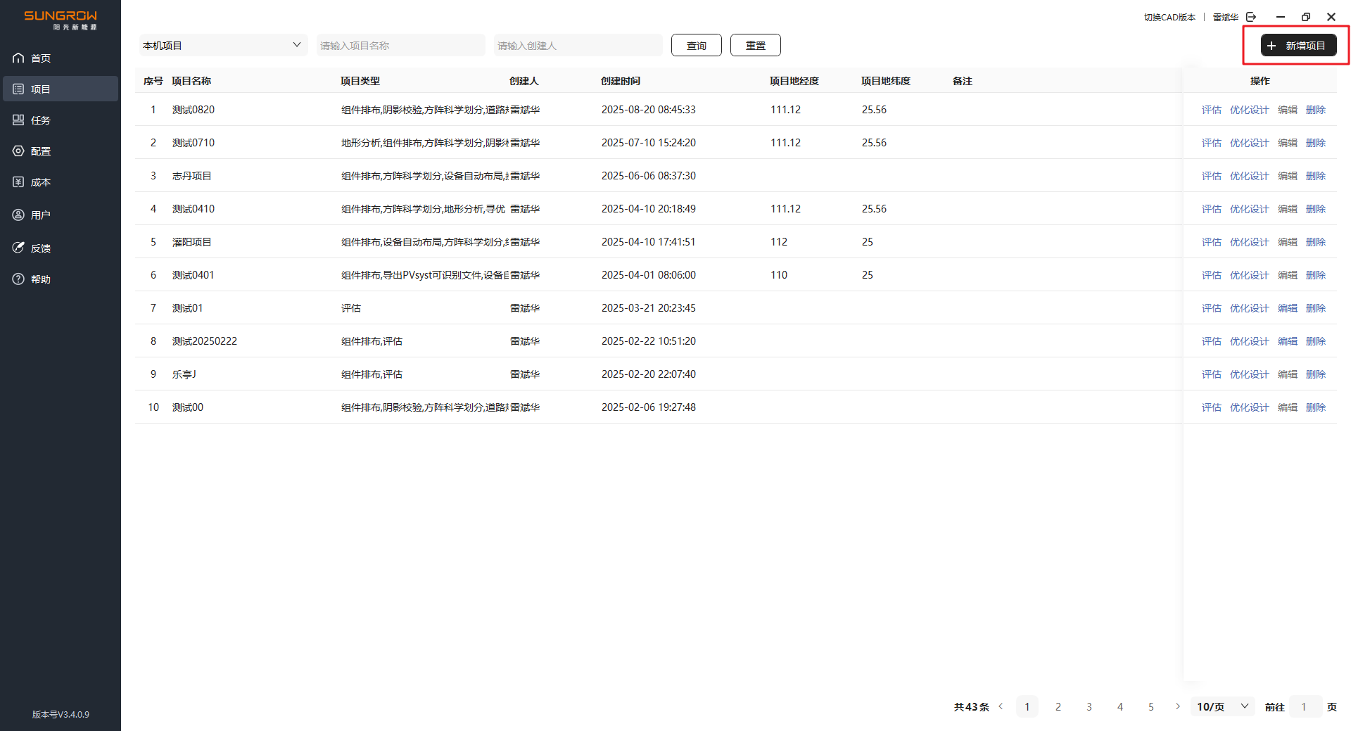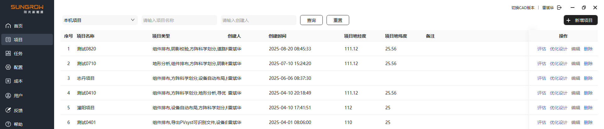 可以查看本人所创建的历史项目目录。从“优化设计”中进入项目进行具体设计。也可以查看每个项目的创建时间和项目进度。输入项目名称或者创建人可以查询项目。