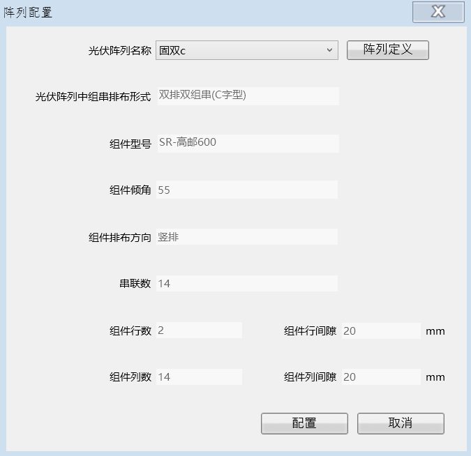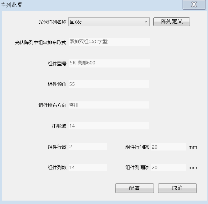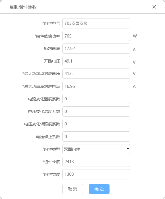 - 组件参数:包含组件规格及对应的短路电流、开路电压、最大功率点电流/电压,组件长度/宽度、单/双面组件。