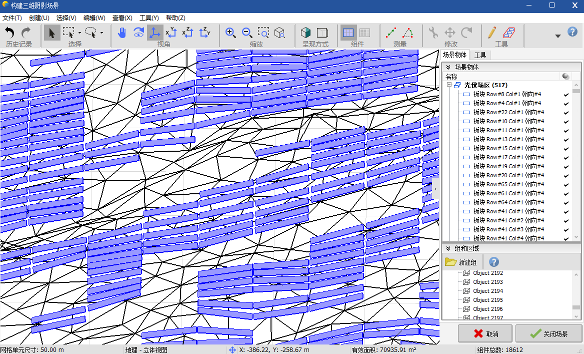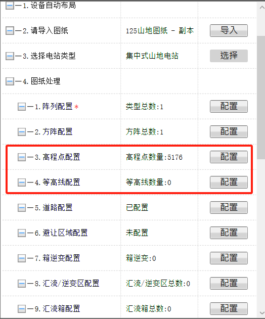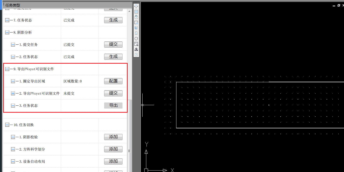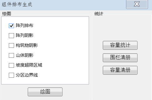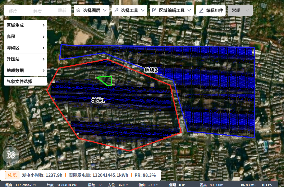 - 设计部分:组件排布、阴影校验、方阵划分、道路规划、设备布局、接地设计、集电线路,以及为实现这些功能进行的信息维护及图纸处理等,并且最终生成处理计算后的图纸和清册。