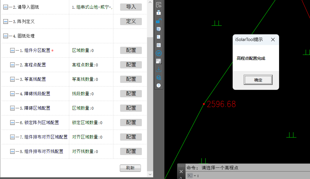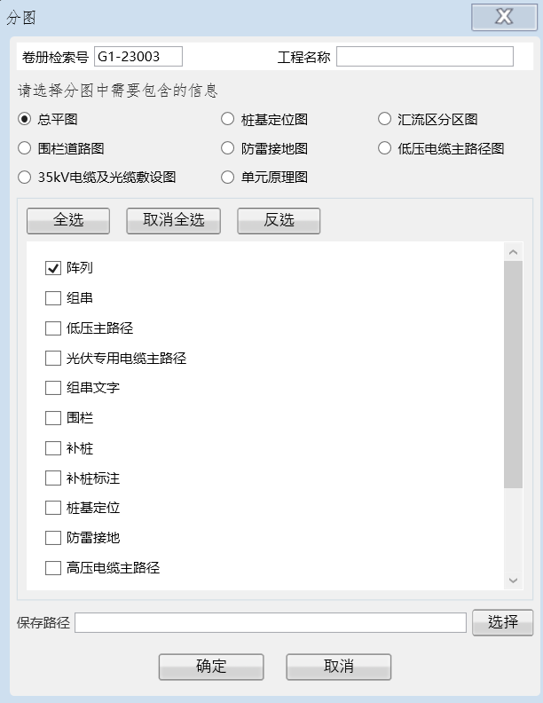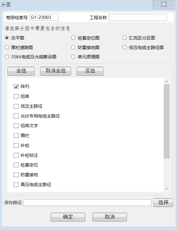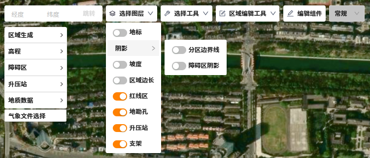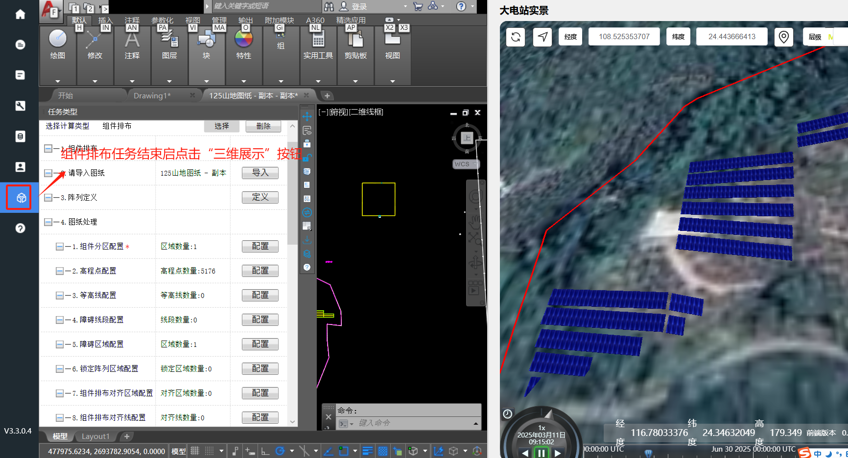 - 设计部分:组件排布、阴影校验、方阵划分、道路规划、设备布局、接地设计、集电线路,以及为实现这些功能进行的信息维护及图纸处理等,并且最终生成处理计算后的图纸和清册。