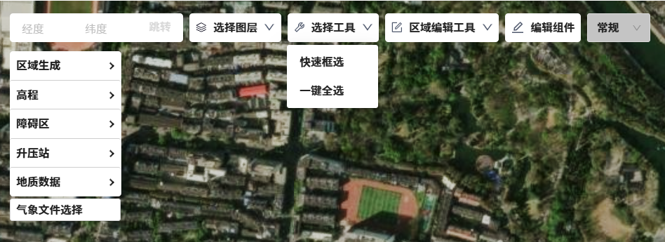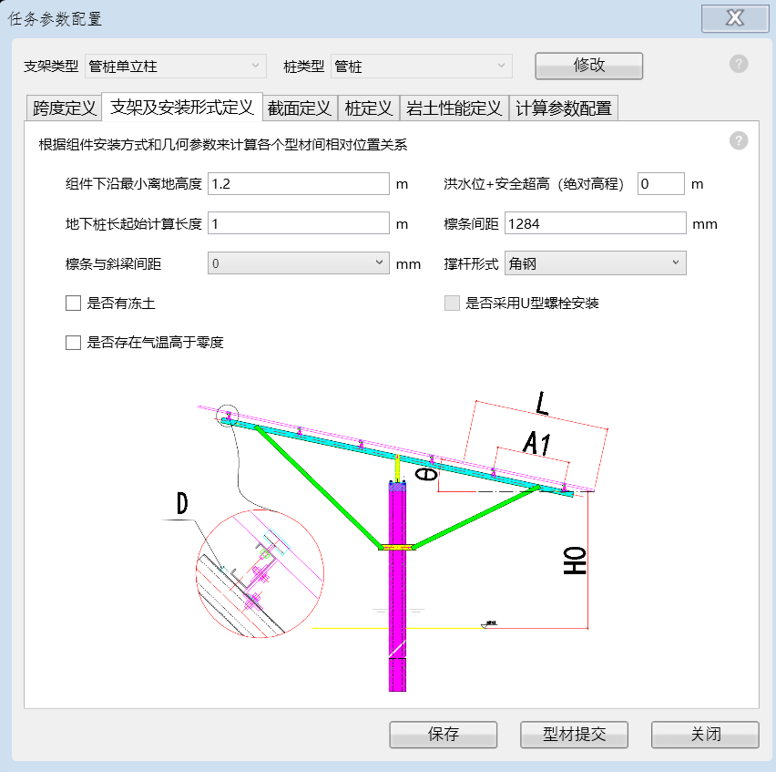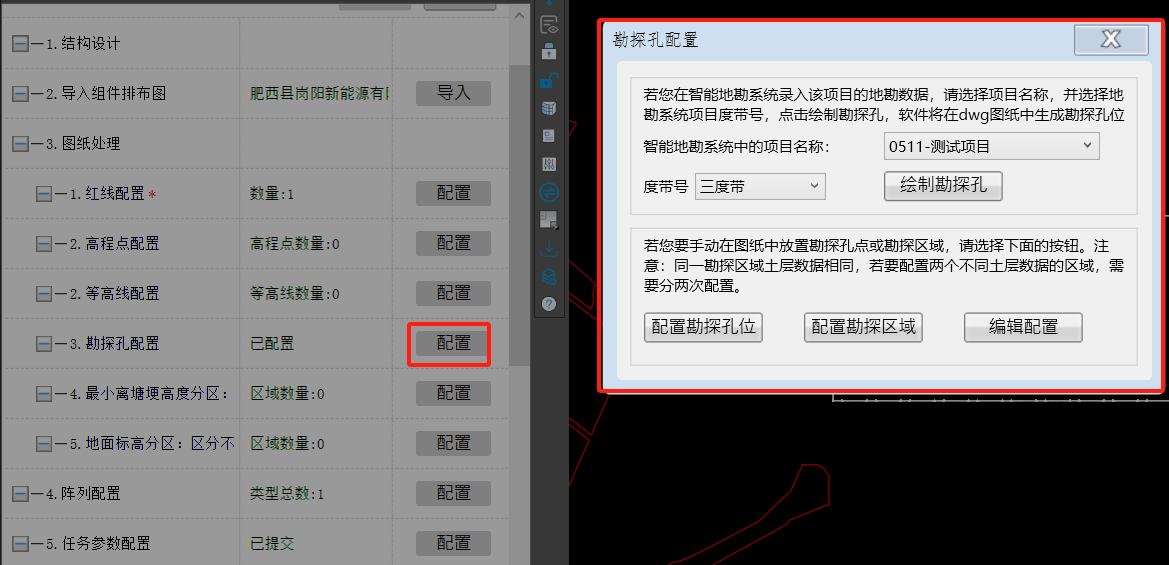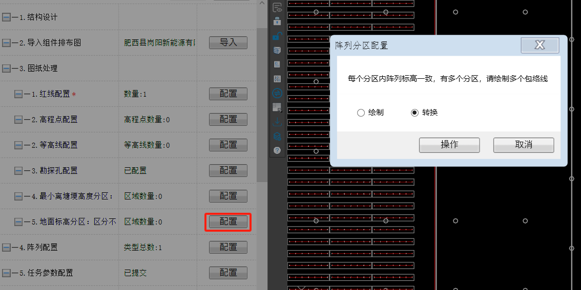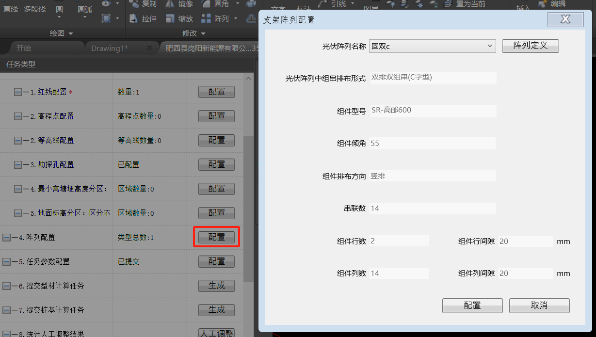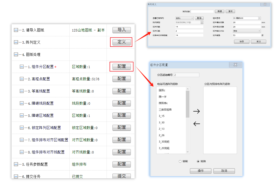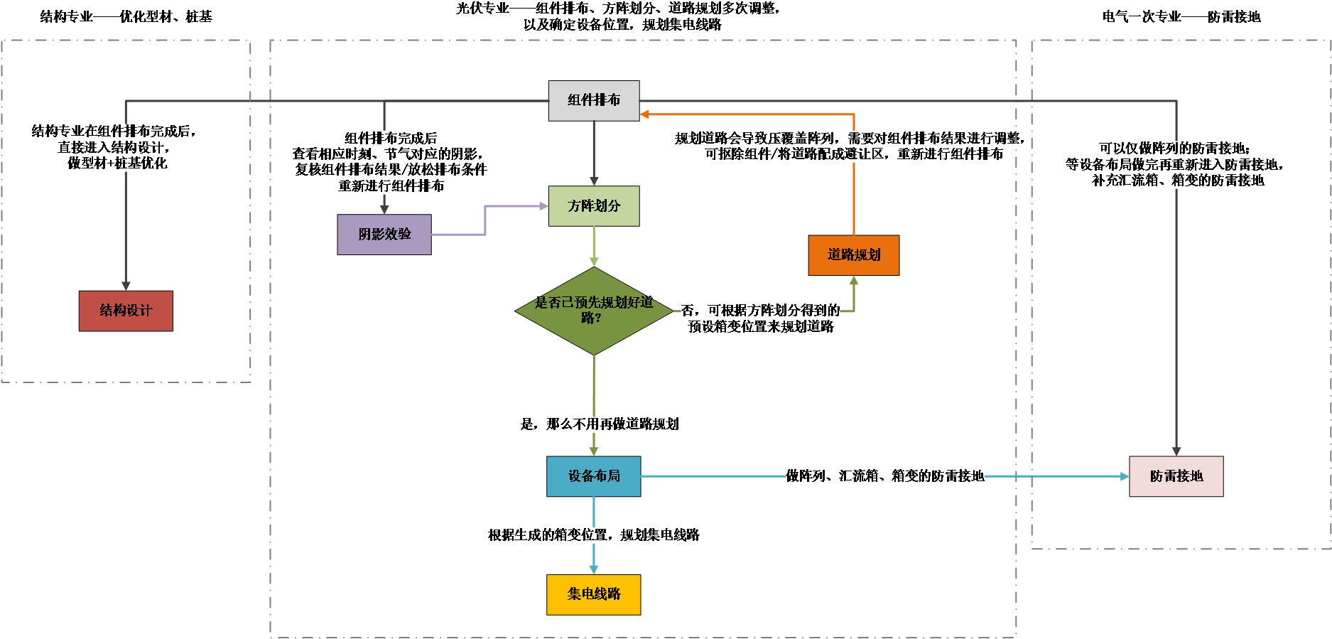 软件有组件排布、道路规划、方阵划分、设备布局、集电线路走线、接地设计多种功能。每个功能基本上都是先进行图纸配置,然后配置任务参数,提交计算,查看返回结果。软件功能的常用使用流程如下: