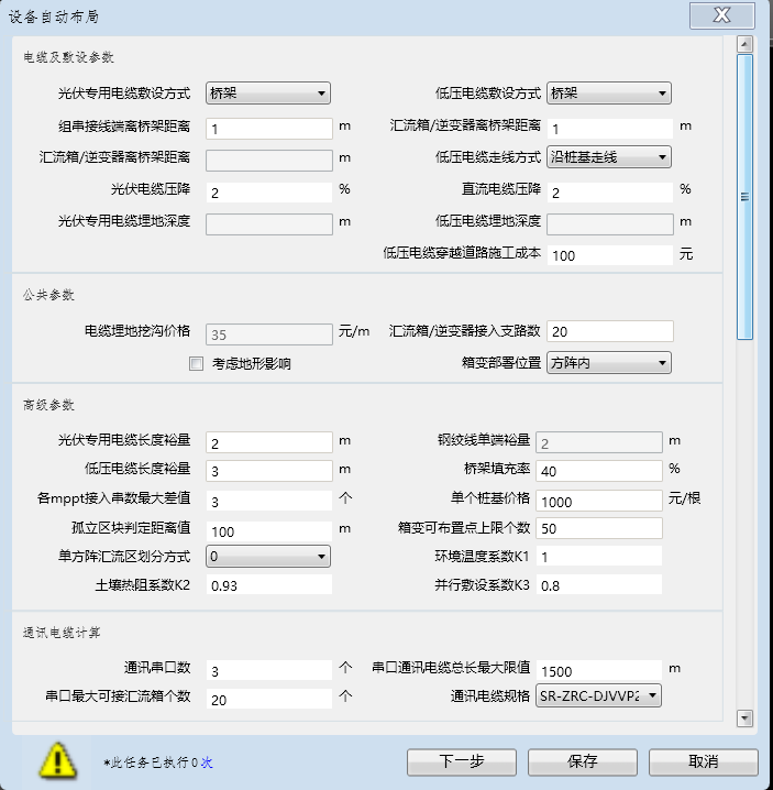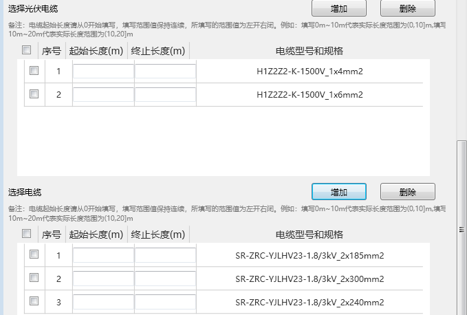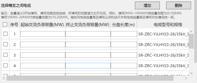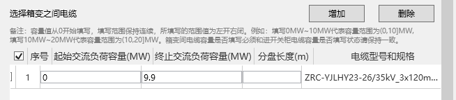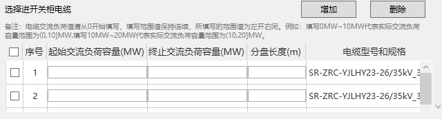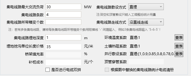 - 电缆参数:包含电缆规格及对应的电阻率、外径、埋地/空气敷设载流量、电缆单价、电缆施工价。