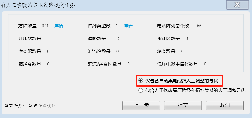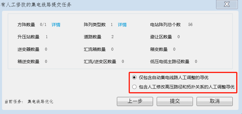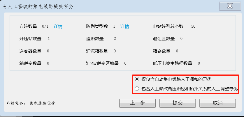 - 集电线路优化:对箱变多种组合方案及走线路径进行计算,寻找一种成本最低的箱变连接及高压线缆走线方案。可支持人工对生成的路径和敷设进行调整,支持埋地、桥架、架空、顶管多种敷设调整,统计工程量。