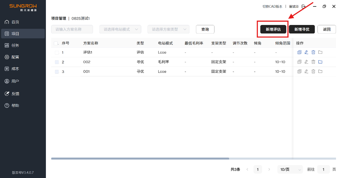 评估区域包含评语与寻优两个功能,评估功能是一套针对既定光伏系统设计方案进行精确量化分析与财务评价的标准化流程。该功能通过构建详细的物理仿真模型与财务模型,输出具备投资决策参考价值的关键指标。比如基于固定输入参数(如倾角、方位角等),输出组件排布个数,总容量,组件排布结果,以及根据输入的不同固定参数,计算得到光伏系统的总发电量、经济性和储能经济性。