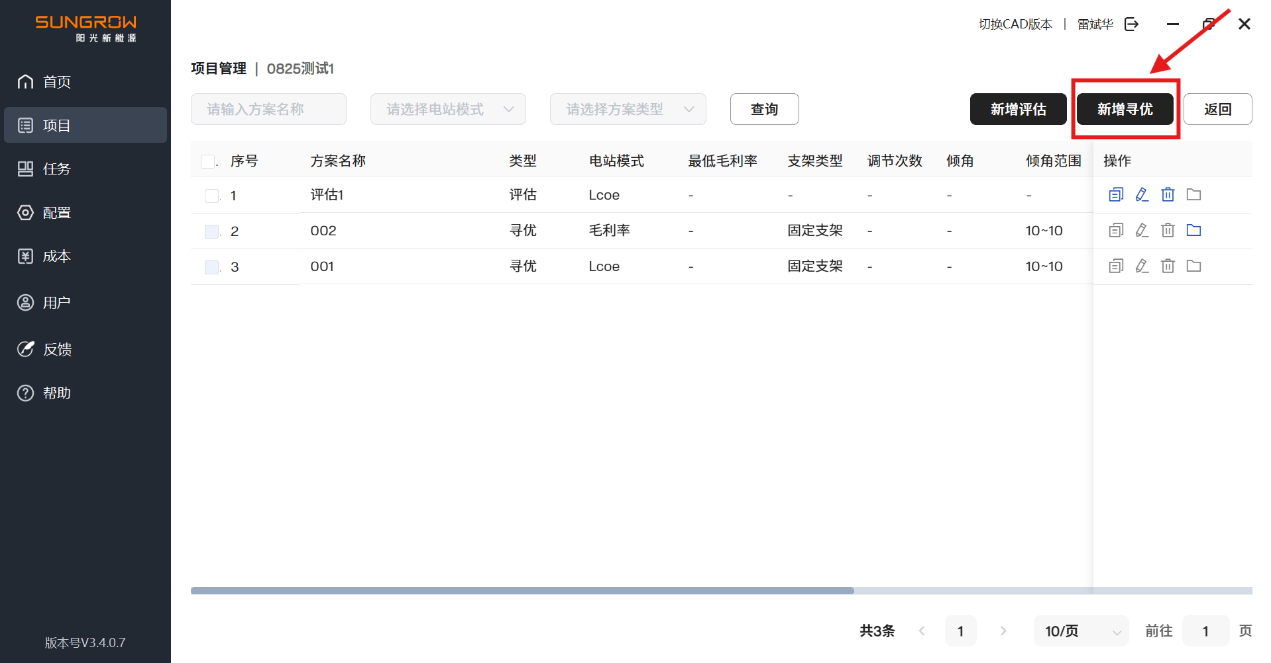 寻优功能采用多目标优化算法在预设参数空间内自动搜索光伏系统的最优配置方案。该功能通过建立参数化模型与优化目标函数,解决多变量约束条件下的最优解搜索问题。比如输入可变参数的取值范围(如容配比范围及步长、方位角范围及步长、间距范围及步长等),输出每个方案的关键参数和指标对比并根据目标函数选择方案范围内最优方案。