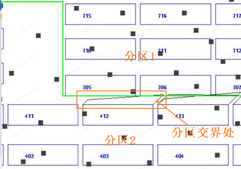 设备自动布局完成后(方阵包络线、汇流区/逆变区包络线、箱变/箱逆变、汇流箱/逆变器已锁定),需要重新调整箱变位置,操作时仅解锁箱变,挪动位置后,提交计算,生成图之后,发现低压走线错误,连接到错误的箱变位置。以下情况是将#2箱变放在远离#2方阵的位置,错把#1箱变当成了#2箱变。