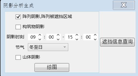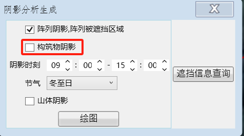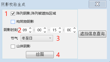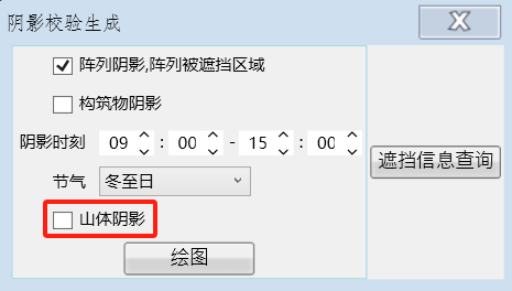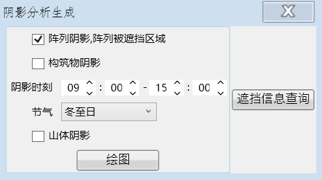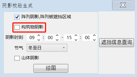 阴影效验中有 “阴影遮挡信息”查询功能。在查询中,是统计图层“sg阵列被遮挡阴影”图层所对应的阵列容量,并非统计“sg阵列阴影”对应的容量。在对照图纸和数据时注意区分。
