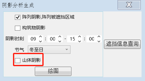 - 阴影效验:进行外部图纸的识别,计算山体阴影、障碍物阴影、阵列前后排阴影,效验当前阵列排布下的阴影结果。可选择相应的时刻,查看时刻范围内的阴影遮挡情况。
