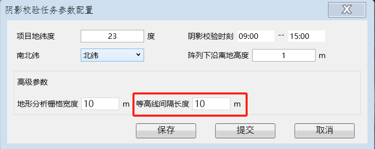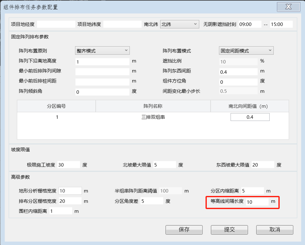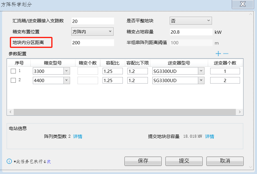 在方阵科学划分任务中,在地块内分区距离设置了参数值(默认值200m),提交计算,一直提示分区距离不能小于最长阵列长度。
