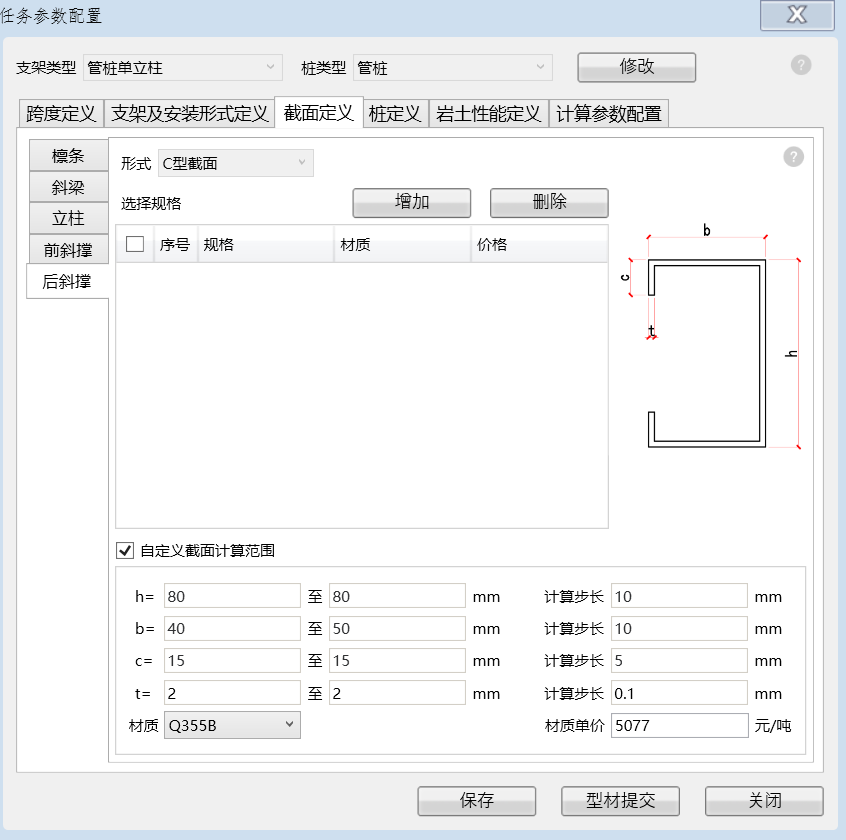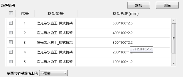- 桥架参数:包含桥架型号及对应的跨距、单价;