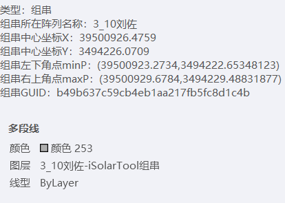 :点击后,鼠标移动到设备上, iSolarTool设备的属性将悬浮显示。目前可展示属性的元素包含:方阵包络线、组件排布分区线、组件排布避让区、人工修改高压路径、汇流区分区线、组串、阵列、升压站、箱变、箱逆变平台、汇流箱、逆变器、架空线路。
