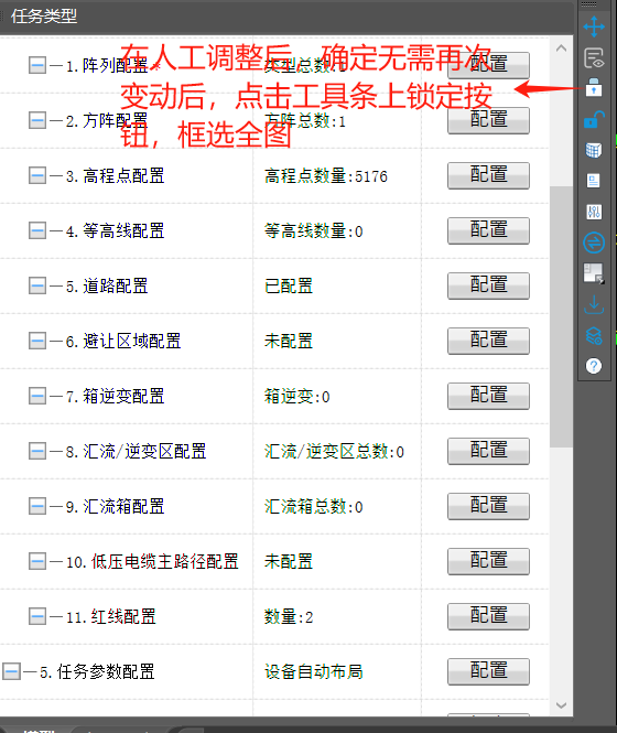原因:由方阵划分切换到设备自动布局功能时,想锁定汇流箱/逆变器,必须同时锁定方阵包络线、汇流区/逆变区包络线、汇流箱三个图层。