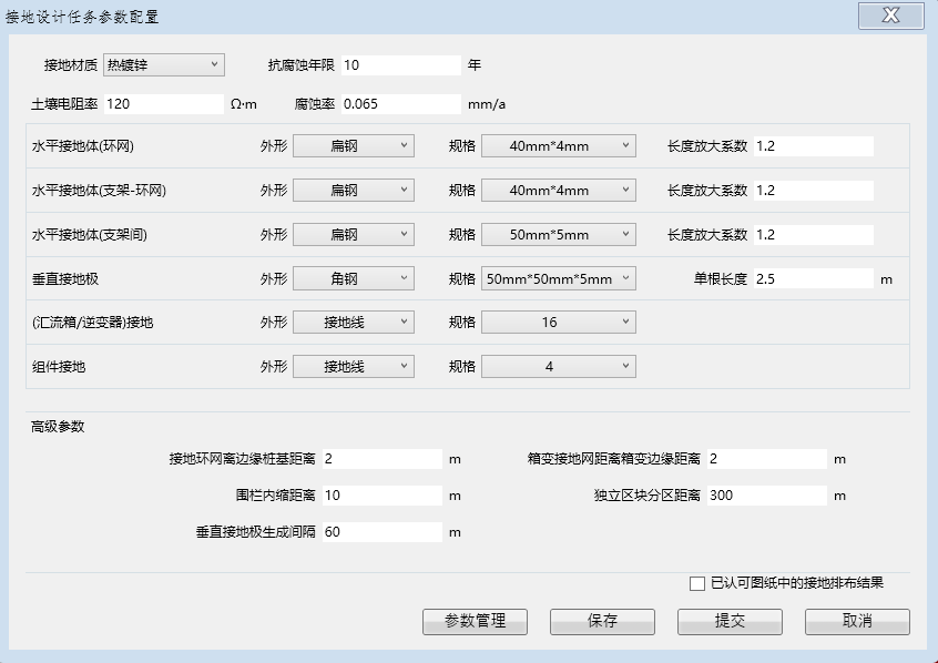 - 接地设计:根据厂区内避让区信息、道路信息等,实现厂区内接地干线、接地支线设计,包含接地环网、阵列-阵列间接地、阵列-环网接地设计,并能完成接地材料规格的腐蚀率和电阻率验算