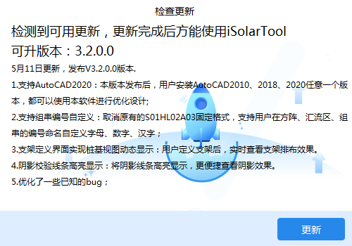 - 启动iSolarTool软件后,检测是否有升级包,如有,会出现检测更新弹框提醒,点击更新。