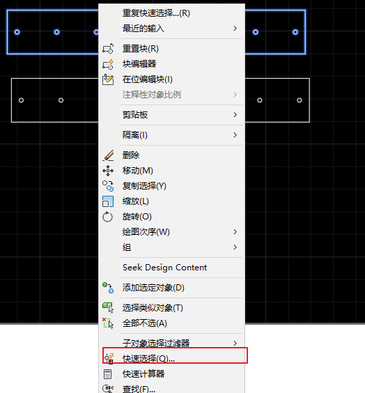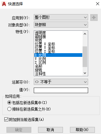 - 打开快速选择中,应用到整个图形,对象类型块参照,特性选择X比例、Y比例、Z比例,运算符不等于,值填写1